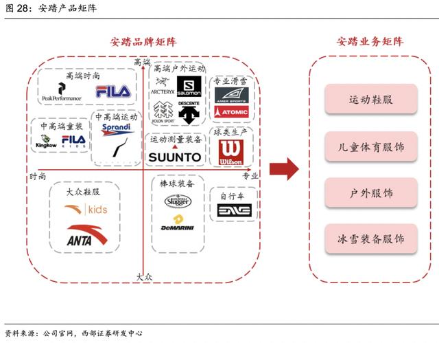 2015年起,高端滑雪品牌DESCENTE、中高端童装品牌KingKow,以及韩国品牌KOLON陆续被安踏收归麾下。此后,安踏又完成对Amer的收购要约,高端和超高端户外领域形成完整闭环,不同品牌定位互补,相得益彰。产品的使用情景覆盖运动休闲、专业运动,以及高端时尚等各方面,满足不同消费群体对不同使用情景的产品需求。
