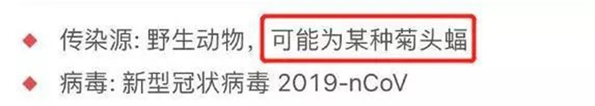 这次的事情大家也都关注得不能再关注了,传染源一栏,写着野生动物,可能是某种菊头蝠。
