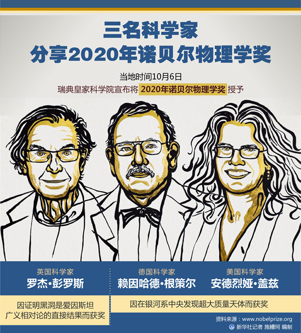 新华社斯德哥尔摩10月6日电(记者和苗 付一鸣)瑞典皇家科学院6日宣布,将2020年诺贝尔物理学奖授予三名科学家。英国科学家罗杰·彭罗斯因证明黑洞是爱因斯坦广义相对论的直接结果而获奖;德国科学家赖因哈德·根策尔和美国科学家安德烈娅·盖兹因在银河系中央发现超大质量天体而获奖。